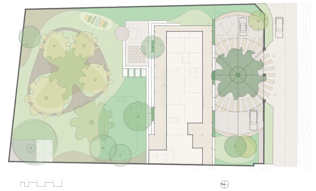 Programa: Learning Studios, Library, Art Studio, Kitchen, Meeting Areas, Admin Workspace, Vegetable Garden, Chicken Coop, Compost Area, Bathrooms, Storage