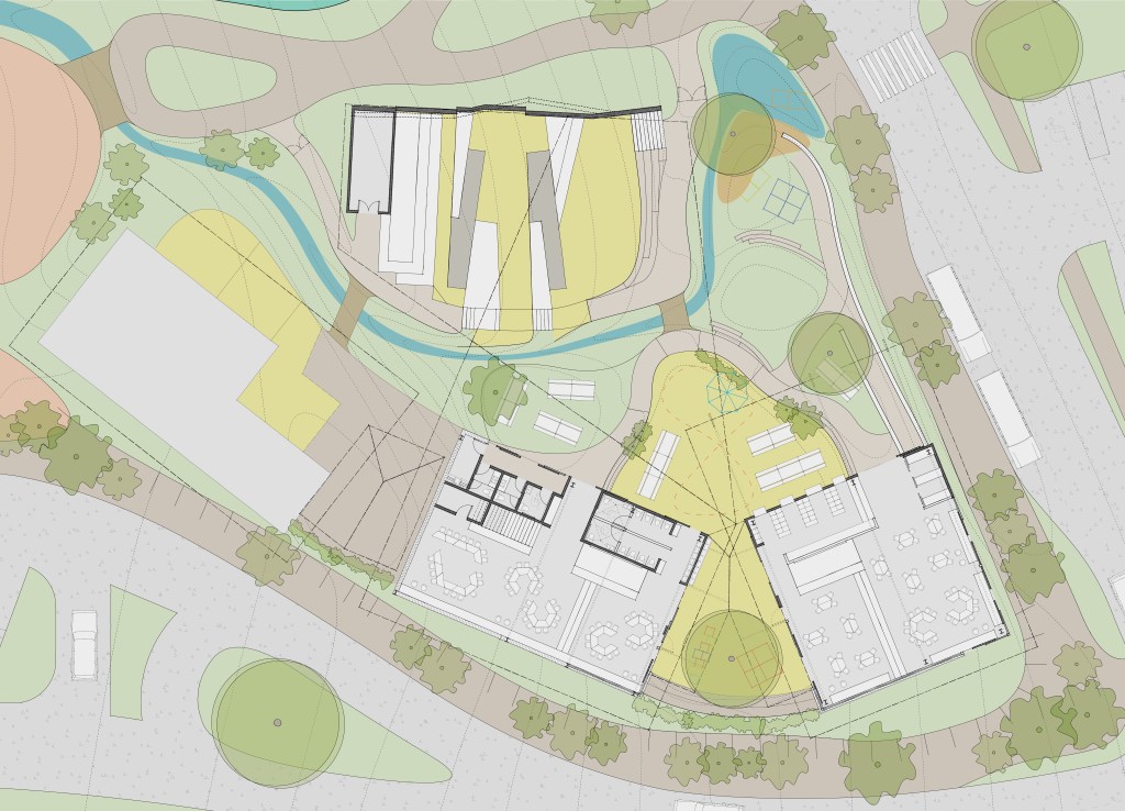 Mediante una volumetría que unifica los espacios exteriores e interiores, se integran las áreas de clase, juego y administración, facilitando la visibilidad, seguridad y control en todo espacio.