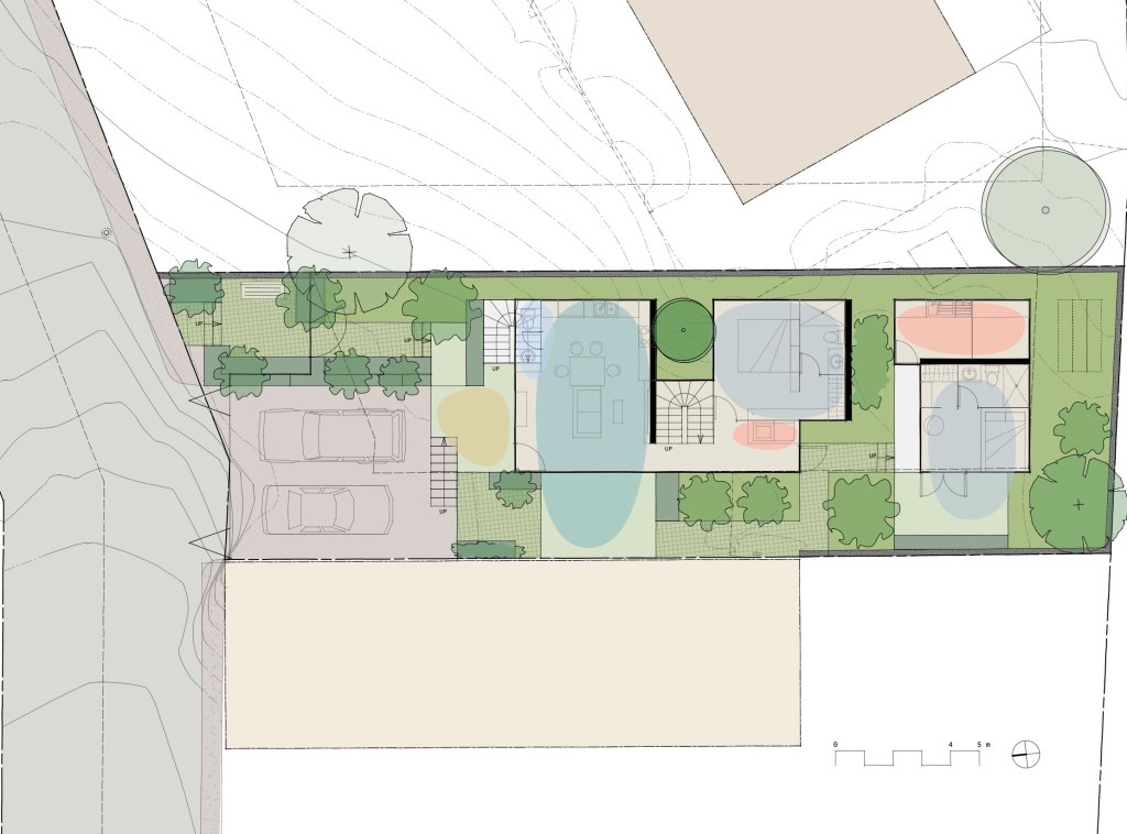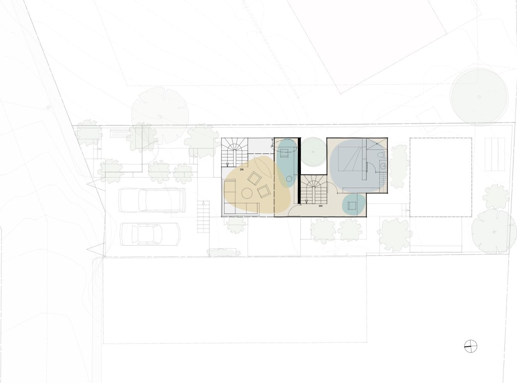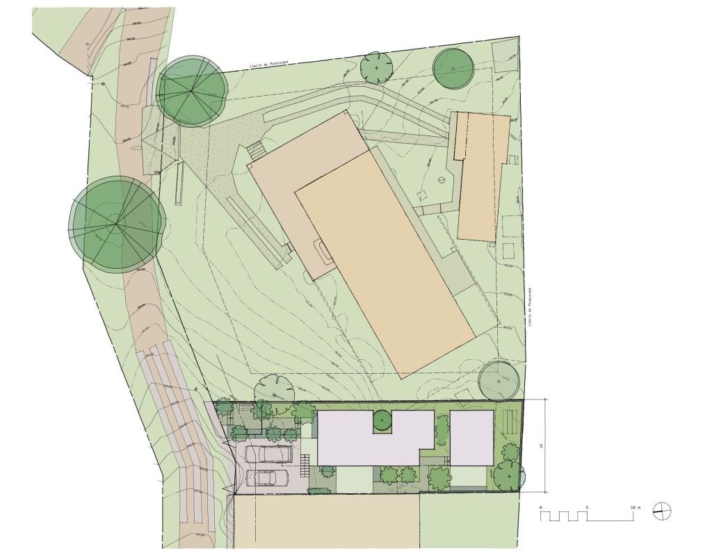 Con el fin de aprovechar la amplitud del terreno familiar, se desarrolla la idea de un apartamento al costado oeste de la casa principal. Se define un terreno de 317 metros cuadrados para el nuevo edificio, en el que se respetan las regulaciones urbanas de la zona. El edificio se separa de los vecinos para lograr ventilación e iluminación natural, además de áreas verdes en los alrededores.
